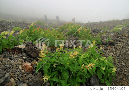 御嶽・霧の頂上直下を行く登山者とオンタデ