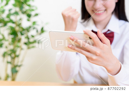 スマートフォンを持ってガッツポーズする女子高校生 動画視聴 アプリゲーム アップ顔無し