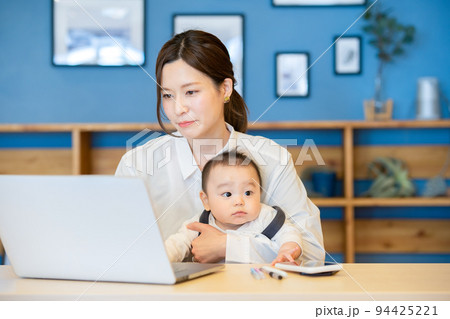 赤ちゃんを抱えてパソコンを操作する女性