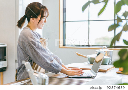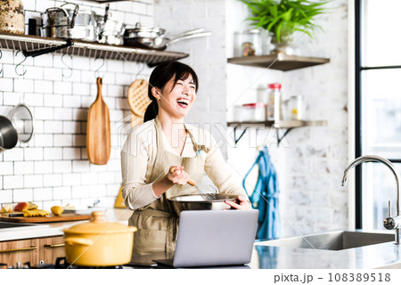 キッチンでノートパソコンの動画を見ながら料理をする主婦のイメージカット