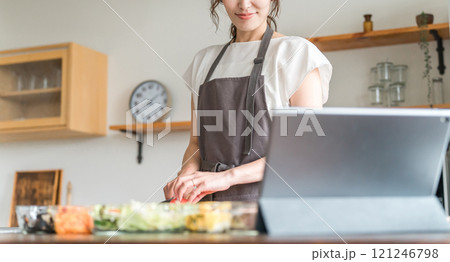 キッチンでタブレットパソコンの動画を見ながら料理をする主婦のイメージカット