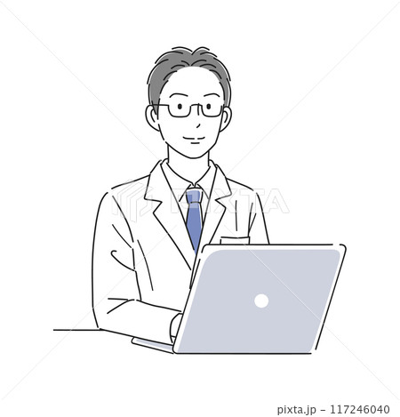 ノートパソコンで仕事をする白衣姿の男性医師のイラスト素材