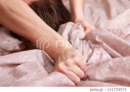 Closeup shot of hands of woman pulling the sheets in ecstasy, orgasm.