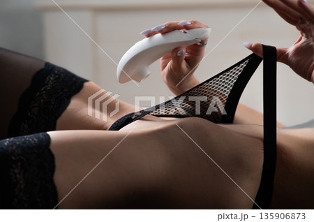 A woman holds a vacuum vibrator near her panties..
