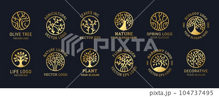 Logo tree. Life, oak circle icon, line olive nature symbol, botanic branch and leaves, eco sign. Emblem or badge golden outline isolated plant elements. Garden logotype. Vector abstract design