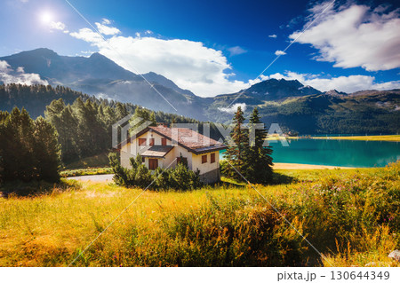 Great view of the azure pond Champfer. Location Swiss alps, Silvaplana village, district of Maloja, Europe.