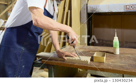 家具製作の組み立て工程で接着作業を行う職人