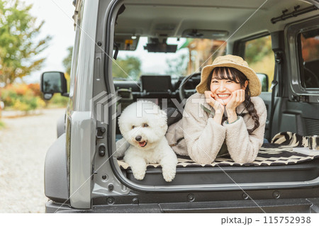 愛犬・ペットと一緒にキャンプ・ハイキング・ドライブに来た若いアジア人女性