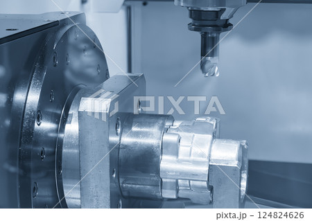 The 4-axis CNC milling machine cutting the automotive parts in the light blue scene.