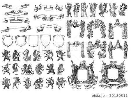 Heraldry in vintage style. Engraved coat of arms with animals, birds, mythical creatures, fish