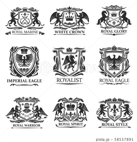 Medieval badges. Heraldic emblems collection with silhouettes of ribbons knight weapons lions crowns swords vector set