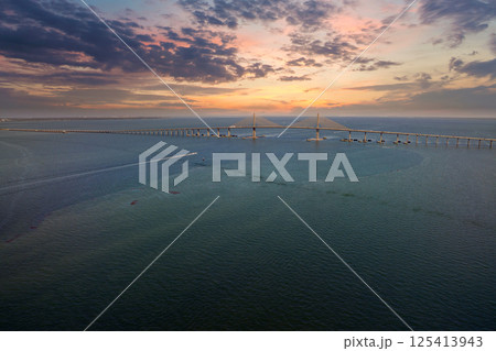 Aerial view of Sunshine Skyway Bridge over Tampa Bay in Florida with moving traffic. Concept of transportation infrastructure