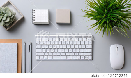 A top-down view of a neatly organized modern office desk, featuring a silver wireless keyboard, white mouse, spiral notebook, and two different potted plants on a simple grey surface
