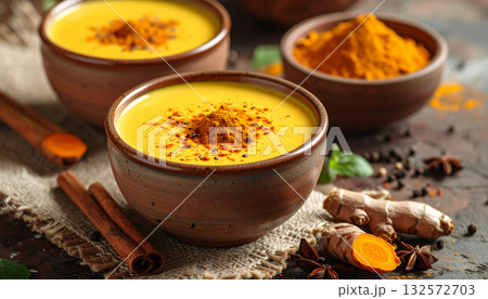Golden Turmeric Latte Bowl . Drinks concept. Generated Image