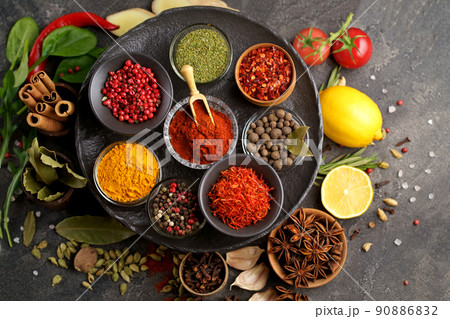 Various spices a vintage spoons on stone table. Colorful Herbal and Spices Oriental marketplace.Top view . Cafe concept. Delicious food delivery.
