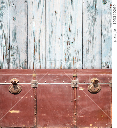 Retro background with red vintage chest upholstered in leather with brass snaps and wall with wooden boards. Product display template. Shabby chic style backdrop. Copy space for text