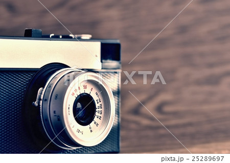 Russian old analog camera on a wooden background.