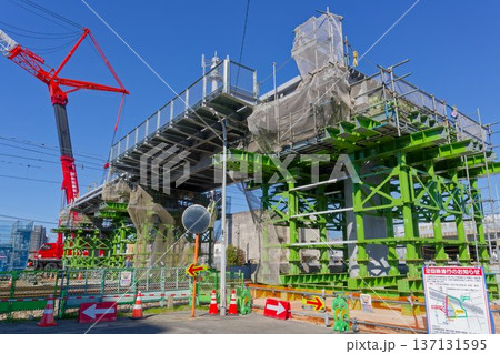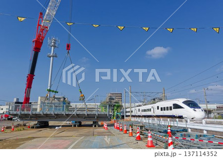 鹿児島本線JR貝塚駅新設工事風景(自由通路の吊り上げ準備)