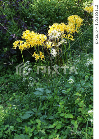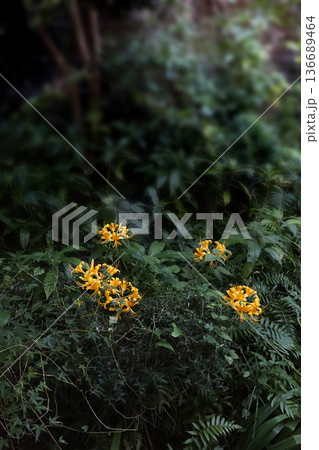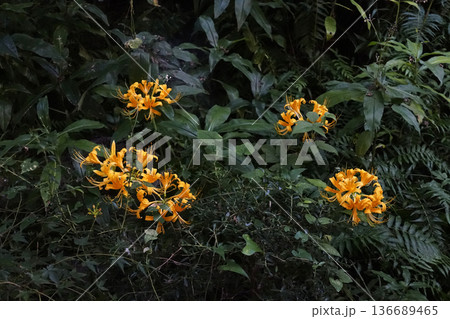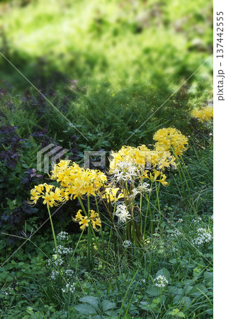 秋10月早朝の藪の中に咲く黄金色のリコリスの花
