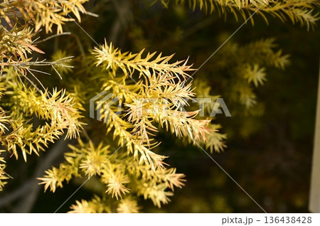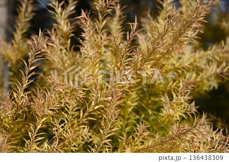 黄金色に輝くメラレウカ(フトモモ科)レボリューションゴールド