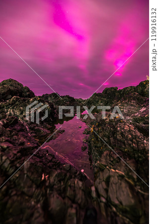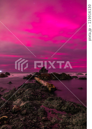 ニュージーランド ウェリントンのレッド・ロックスのビーチと空に広がるオーロラ