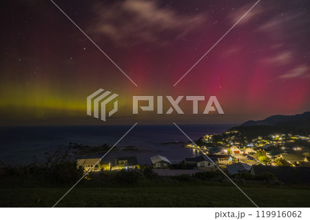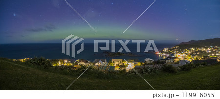 ニュージーランド ウェリントンのアイランド・ベイの夜景と夜空に広がるオーロラ