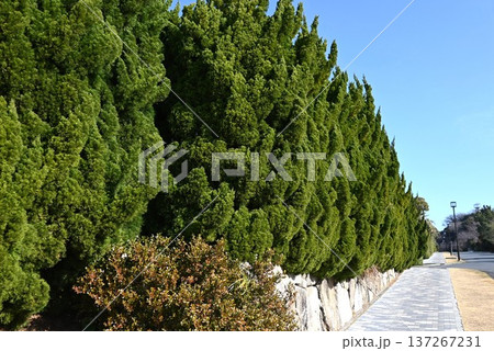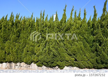 カイズカイブキの生垣・大気汚染や刈り込みにも耐え街路樹や生垣に利用