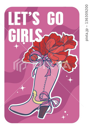 Lets Go Girls Cowgirl Boot Illustration with Flowers and Feminine Quote. pink cowgirl boot decorated with flowers and bows, combined with the motivational phrase