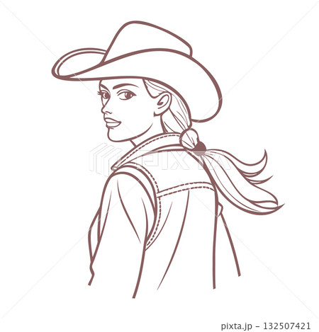 Elegant cowgirl in profile. Cowgirl in a cowboy hat on a white background. Line drawing illustration.