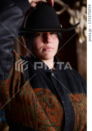 Cowgirl in a dark ranch interior adjusts her hat, wearing a patterned jacket and jeans