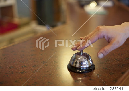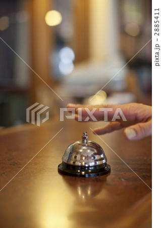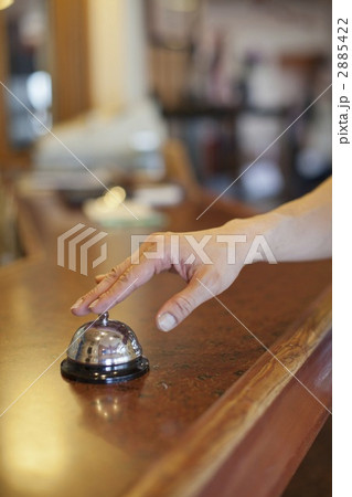 ホテルのフロントで押される呼び鈴のクローズアップ(ホテル フロント 呼び鈴)