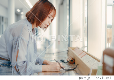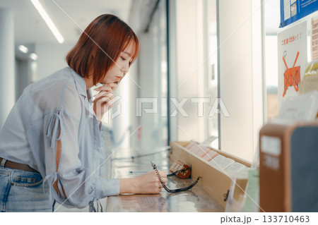 窓口で書類に記入する女性