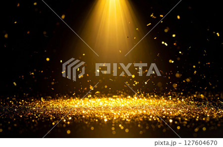 A clear hourglass with flowing gold glitter stands amidst a glittering pile of golden coins against a dramatic dark background, symbolizing wealth and the passage of time.