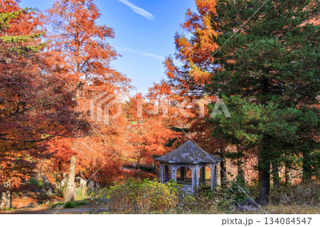 伊豆市 修善寺虹の郷のイギリス村と紅葉とベンチ