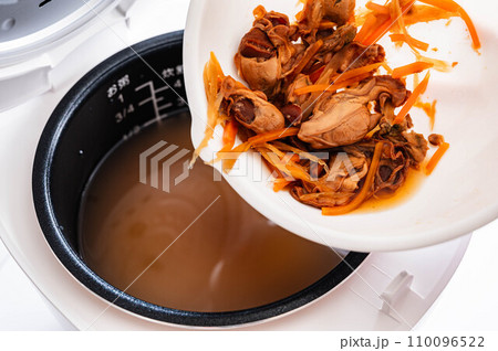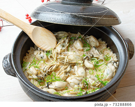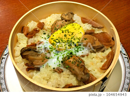白い丼に盛られた牡蠣の炊き込みごはん 写真素材