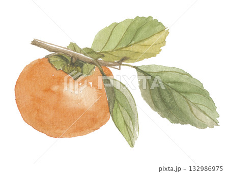 水彩で描いた枝付き柿の実のイラスト 富有柿【手描き】 白バック 透過背景