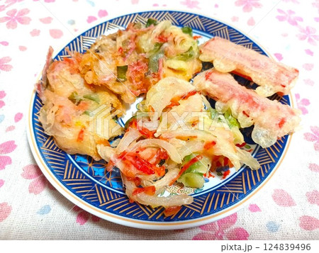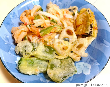 家庭の天ぷら(かき揚げ、レンコン、ピーマン、カボチャ)
