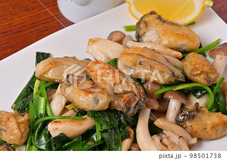 牡蠣のバター醤油焼き、牡蠣料理、カキのバター醤油焼き。カキ料理、牡蠣のソテー。しめじとホウレンソウ。