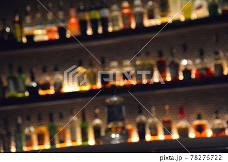 ライトアップされたオーセンティックバーの洋酒のボトルの並んだ棚、バックバー。 ぼかし。