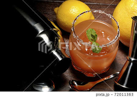 ミント入りソルティドッグとカクテルシェーカーとメジャーカップとグレープフルーツとレモン