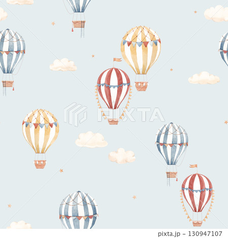 Cute watercolor seamless pattern with striped hot air balloons and soft clouds. Perfect for nursery wallpaper, kids room decor, textile design.