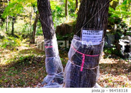 ナラ枯れ害虫被害対策を施された公園の樹木