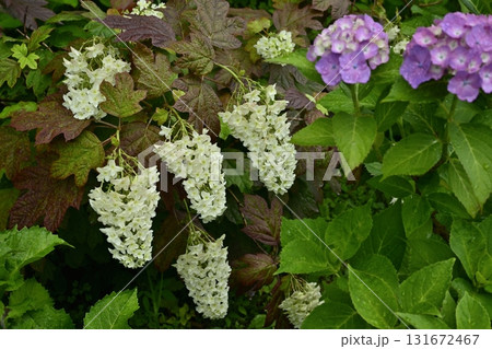 初夏のイングリッシュガーデンの白いカシワバアジサイ