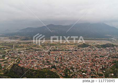 View from cliff top over Kalambaka and Kastraki villages at foot of Meteora mountains, Greece, and famous impressive pillars around it on cloudy day