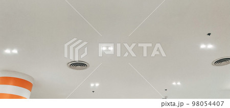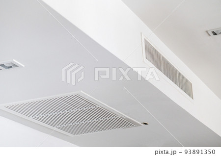Modern white ceiling mounted cassette type air conditioner in office building system work. Ventilation compressor.