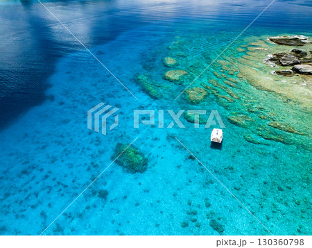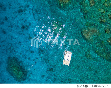 嘉比島のドローン撮影。カタマランヨットに乗ってスキンダイビング中。沖縄県島尻郡慶良間諸島座間味島