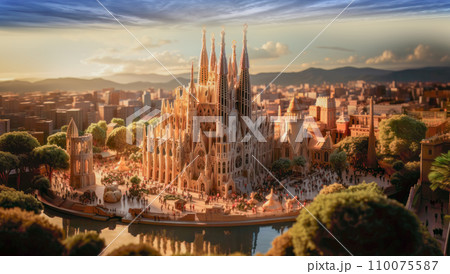 Aerial view of Barcelona City Skyline and Sagrada Familia Cathedral at sunset. Eixample residential famous urban grid. Cityscape with typical urban octagon blocks