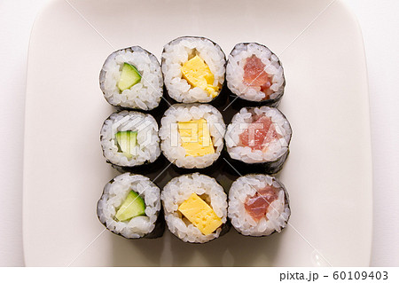 細巻盛り合わせ(鉄火・玉子・胡瓜)。(白皿・白バック・俯瞰)