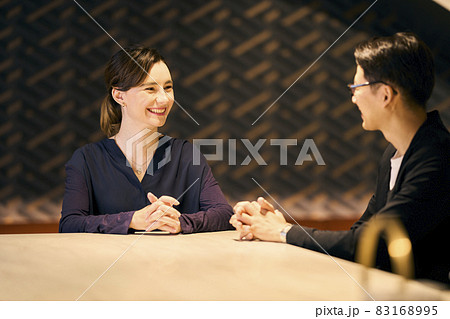 カフェで楽しげに会話をしている男性と女性