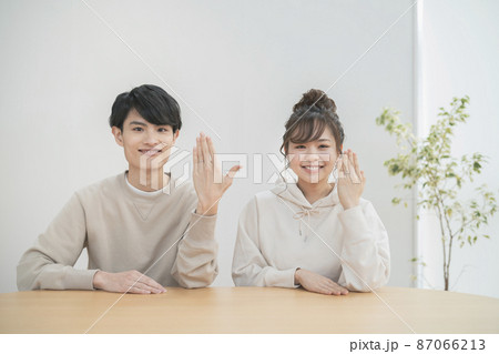結婚指輪を見せる笑顔の若い夫婦 ポートレート